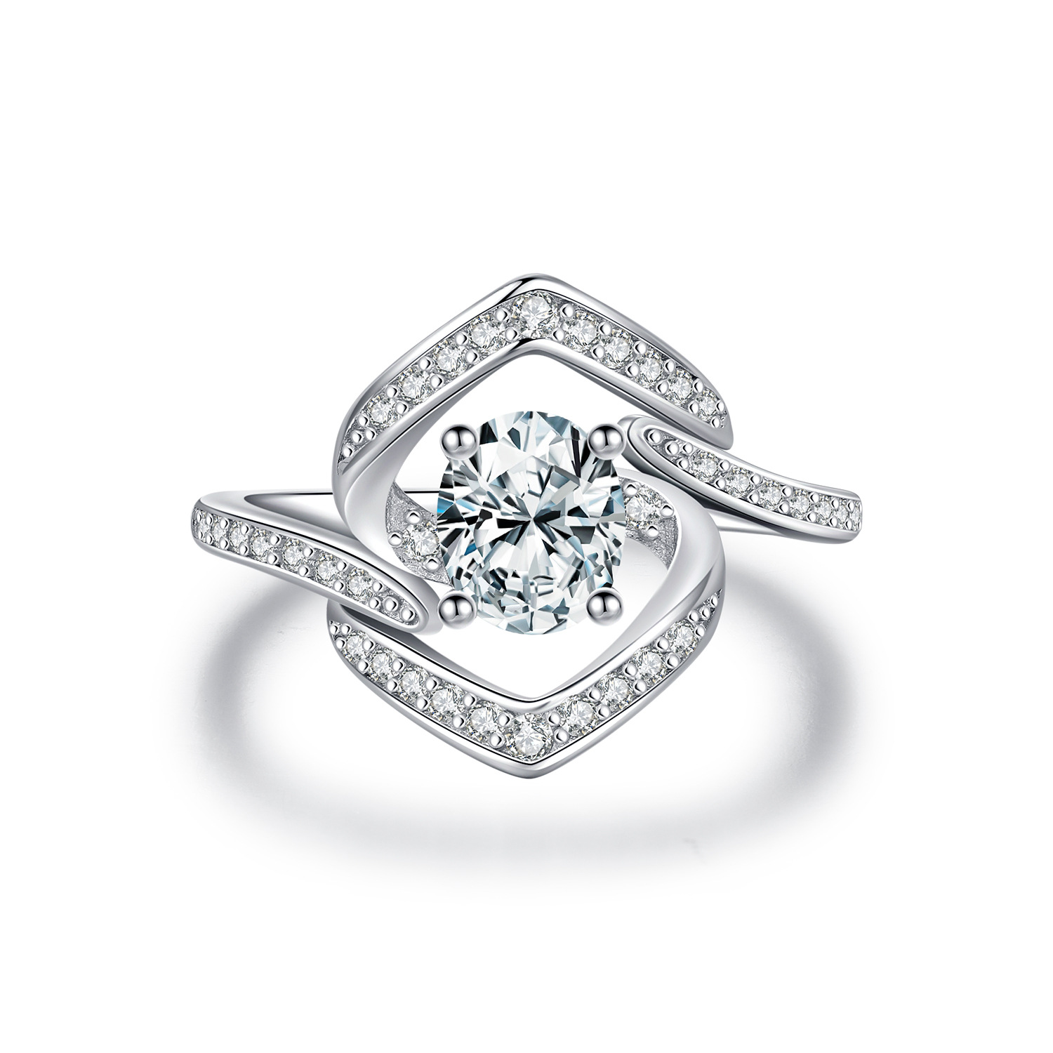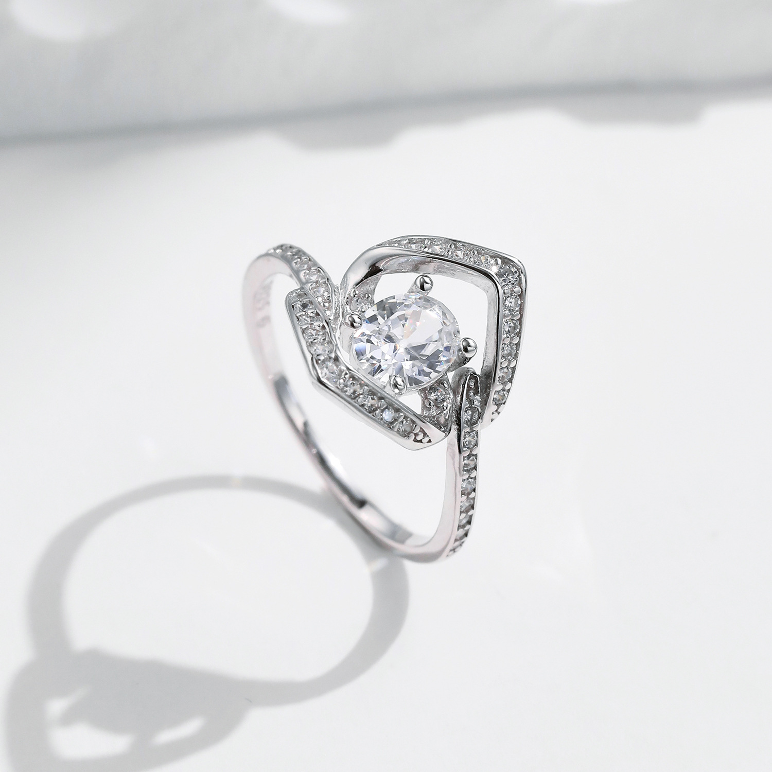 This 925 sterling silver ring showcases a dazzling full pavé setting, crafted with intricate geometric lines that create a bold and artistic look. The brilliant center stone is surrounded by shimmering cubic zirconia, forming a unique layered design that radiates luxury and sophistication. Perfect as a statement piece for parties, evening wear, or as a fashionable daily accessory, this sparkling ring captures attention from every angle. A must-have for women who love modern elegance and high-shine jewelry.