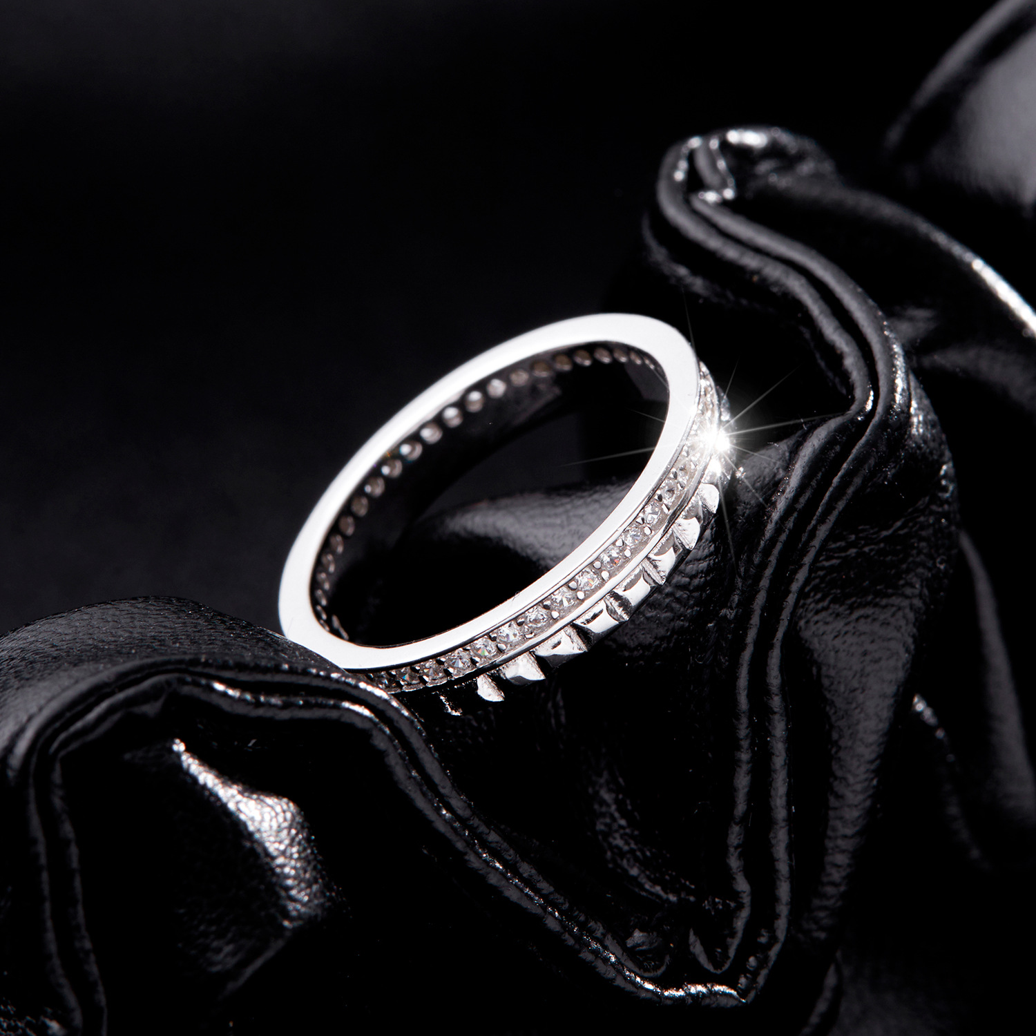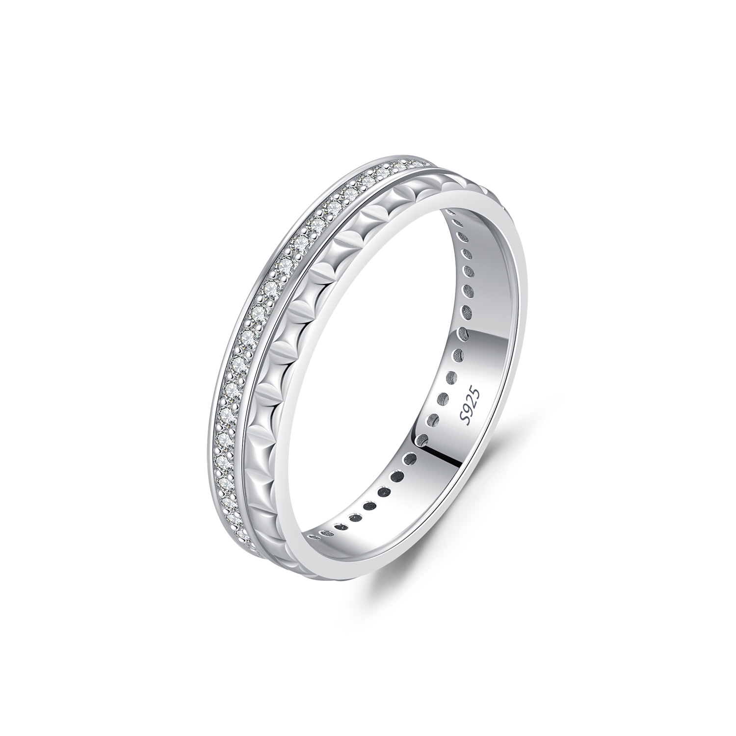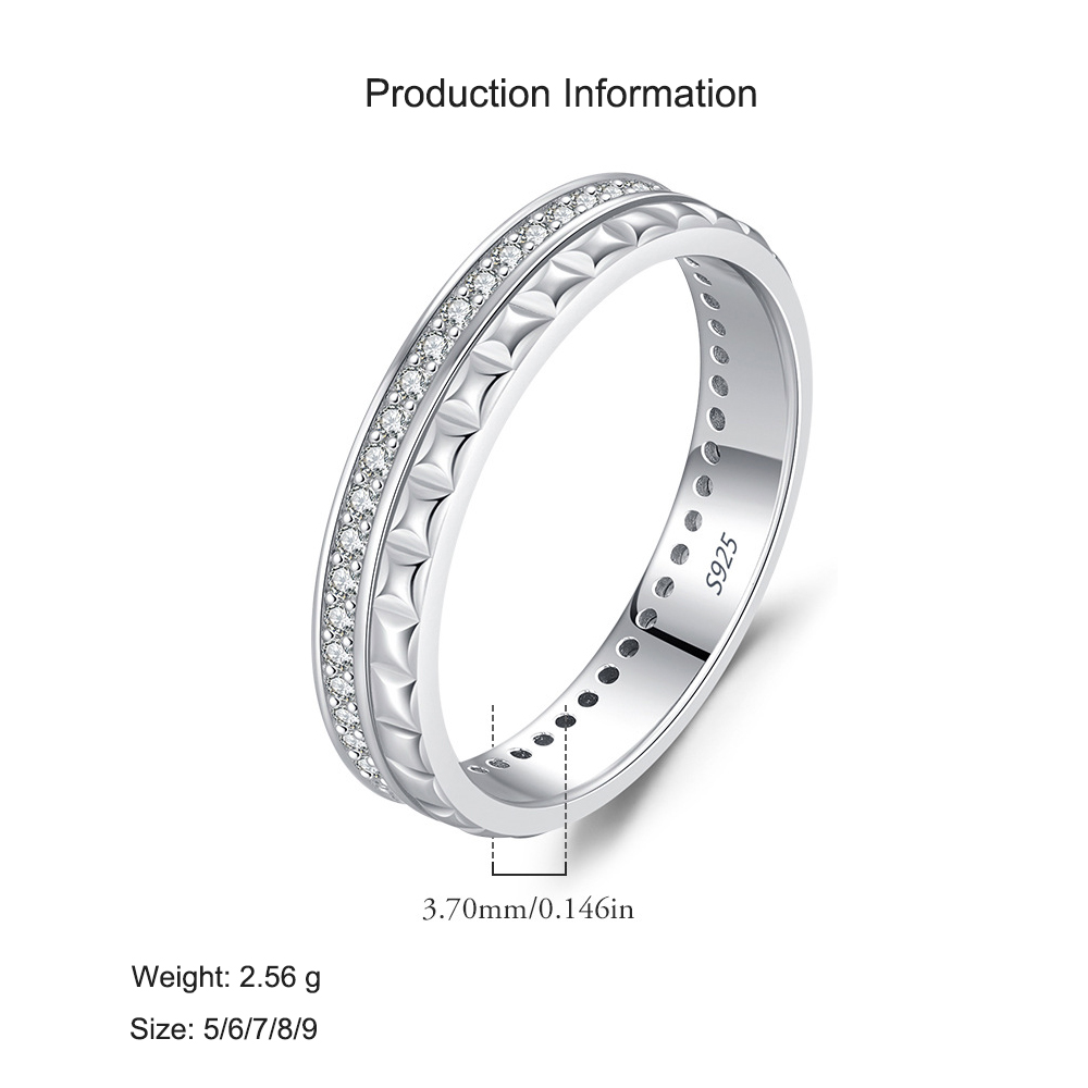 Minimalist with a twist – this 925 sterling silver ring features a sleek band with a raised geometric texture and a line of sparkling cubic zirconia stones. The unisex appeal makes it perfect as a modern promise ring, stacking band, or fashion accessory for both men and women.