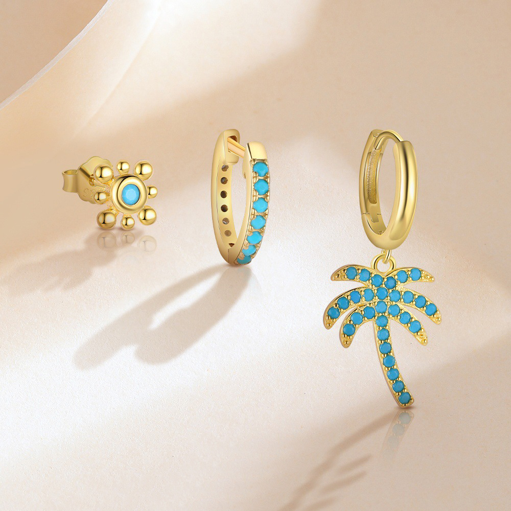 Prepare your inventory for the summer season with our Wholesale 925 Sterling Silver Turquoise Palm Tree Earring Set. "Curated Ear Stacks" are a major trend, and this pre-styled set offers customers a ready-made look. The kit features a "Palm/Coconut Tree" dangle, a pave huggie, and a stud, all set with popular synthetic Turquoise for a splash of color. The "Vintage/Boho" aesthetic appeals strongly to festival-goers and vacation shoppers. Manufactured from solid S925 sterling silver, this set offers high perceived value and multiple styling options.