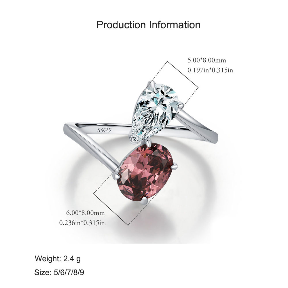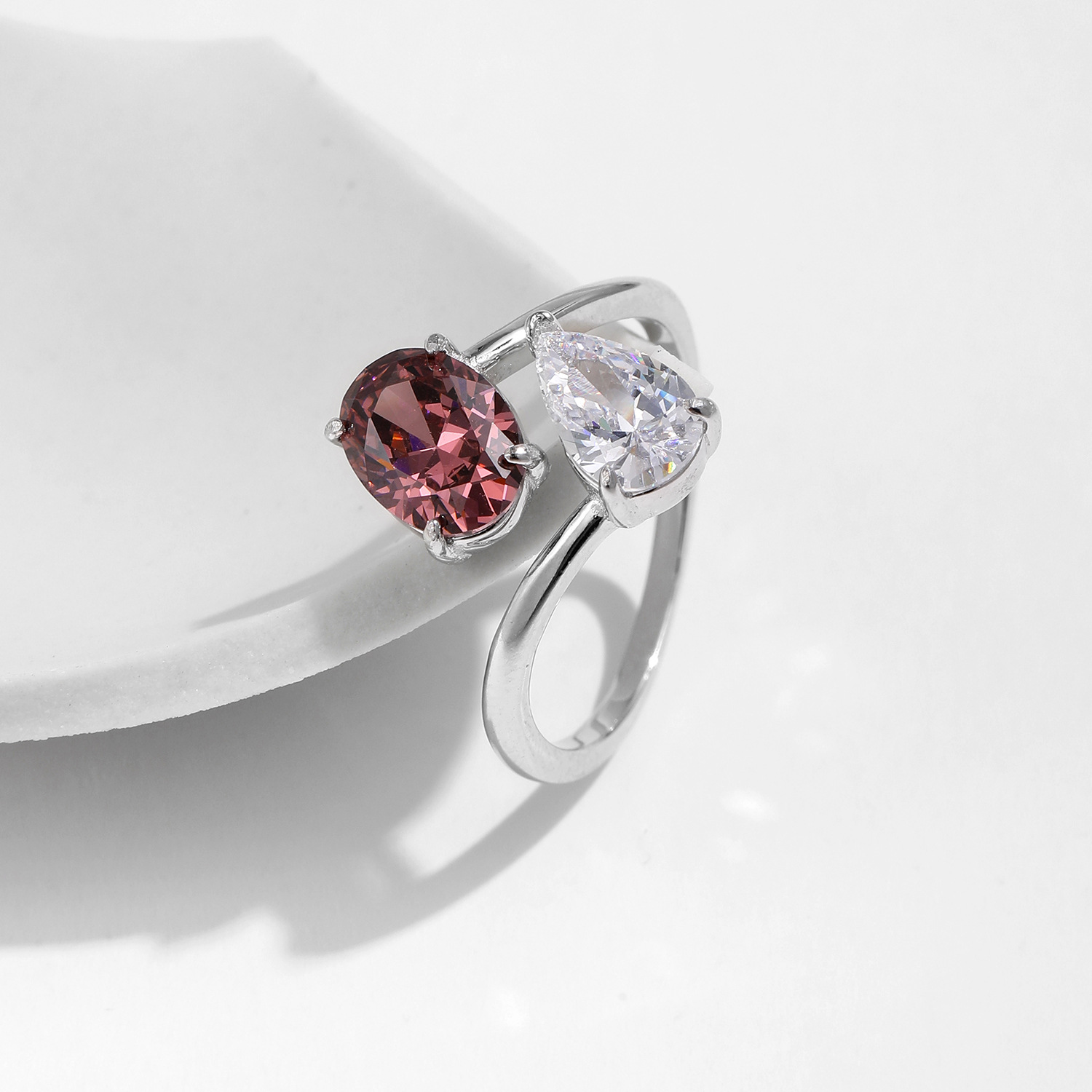 This unique 925 sterling silver ring showcases an artistic irregular crossover band, set with two contrasting gemstones for a striking color-block effect. Featuring a sparkling pear-cut clear zircon and a round-cut rose-red zircon, the ring combines modern minimalism with bold style. Its open design adds an elegant twist, making it a versatile piece for both everyday wear and special occasions. Perfect as a fashion statement ring or a thoughtful gift, this silver gemstone ring highlights individuality and contemporary charm.