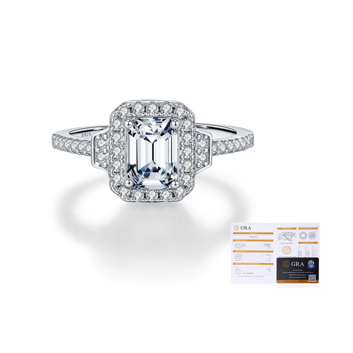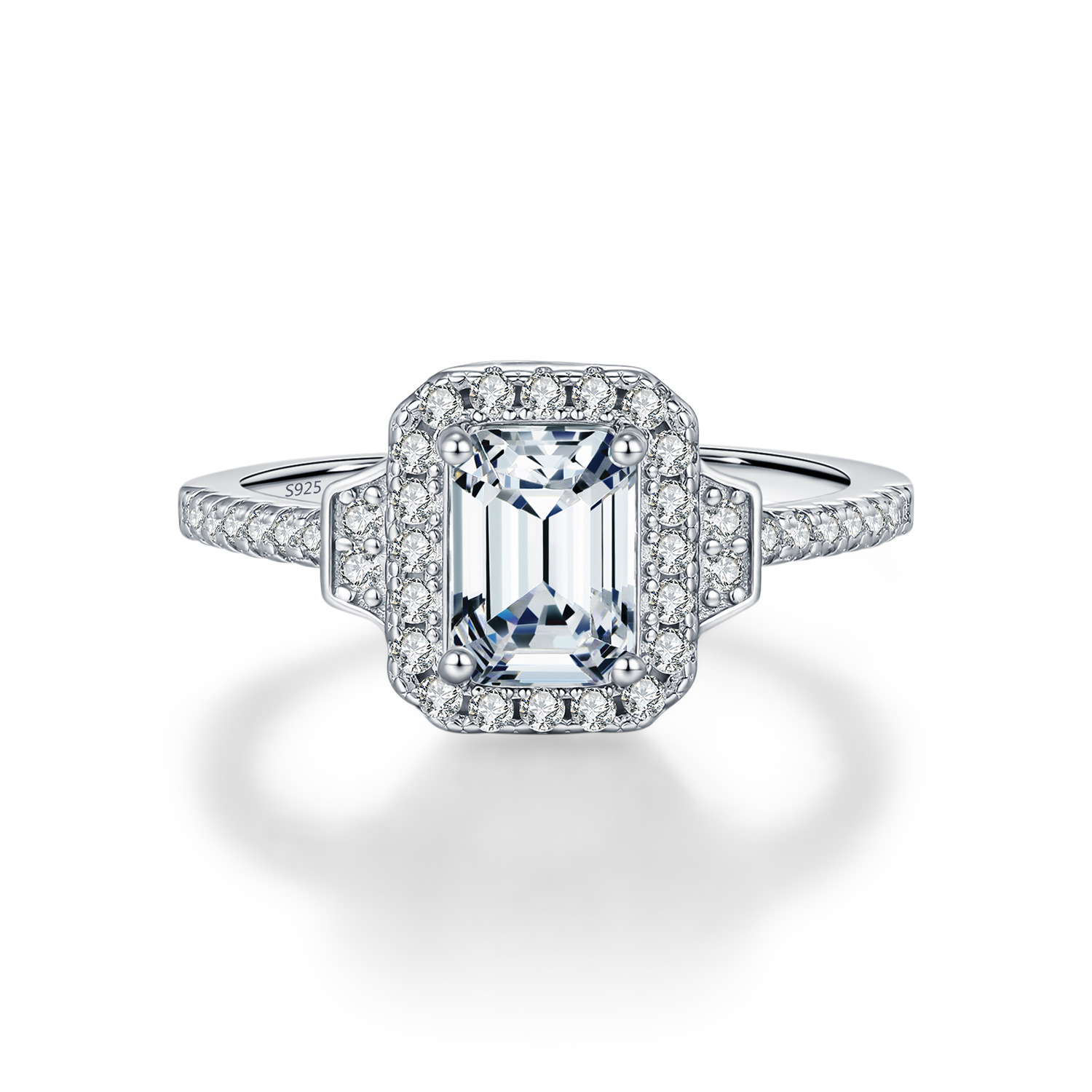 925 Sterling Silver Vintage Emerald Cut Halo Moissanite Ring 110200054
