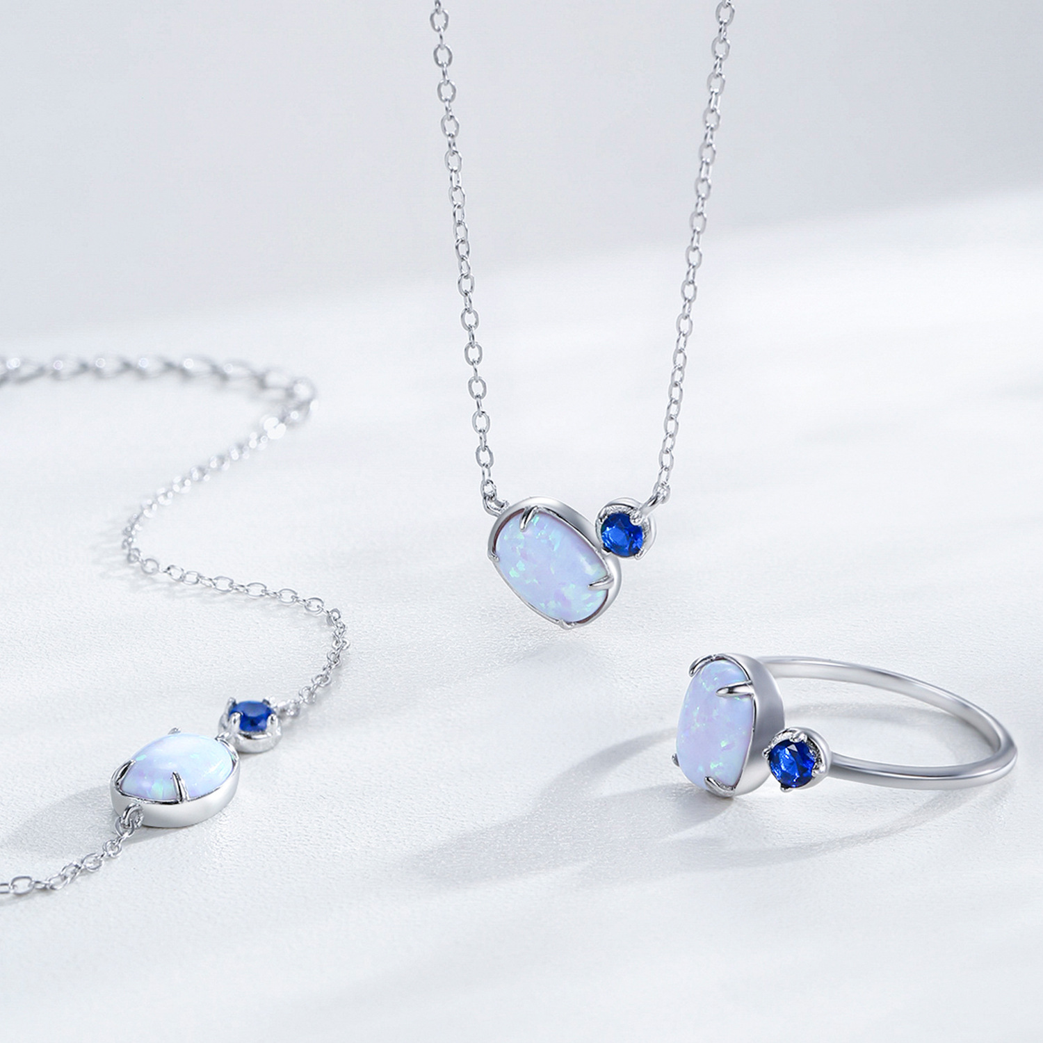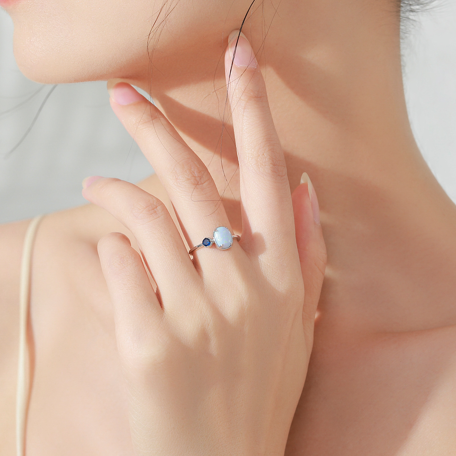 This exquisite 925 sterling silver ring showcases a dreamy blue opal complemented by a deep sapphire-blue cubic zirconia accent. The opal’s ethereal glow captures shifting shades of sky blue and pearl white, radiating timeless elegance and serenity. Delicately set on a sleek sterling silver band, this design is perfect for daily wear or special occasions. A graceful piece that combines sophistication and calm beauty — an ideal gift for someone who loves modern elegance and natural charm.