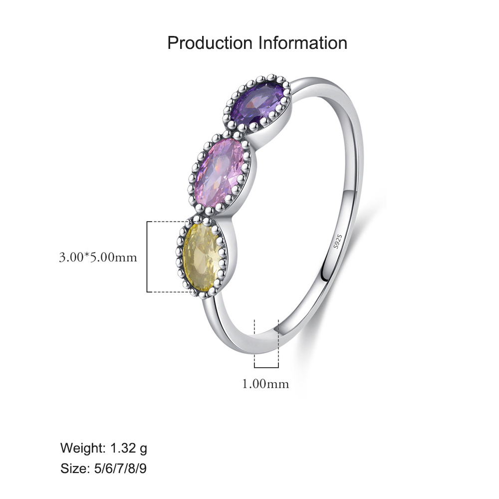 Crafted from 925 sterling silver, this ring features three oval-cut rainbow-colored crystals in soft purple, pink, and yellow tones, framed by vintage-style beaded accents. A perfect mix of retro charm and modern freshness—ideal for daily wear, stacking, or gifting.