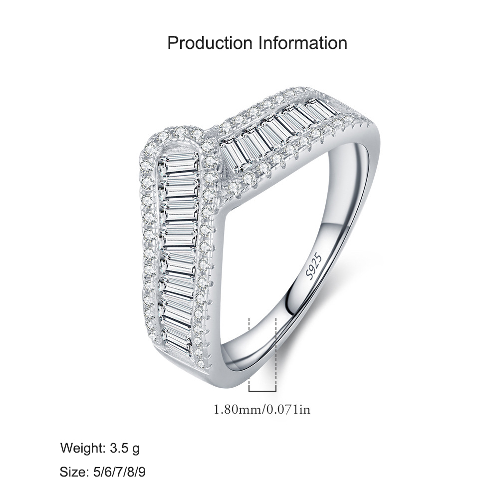 Buy wholesale 925 silver geometric rings with a wide band design and dazzling baguette-cut zircon. This modern sterling silver statement ring adds a touch of bold elegance—perfect for parties, evening wear, or gifting. Ideal for fashion jewelry retailers and online shops.