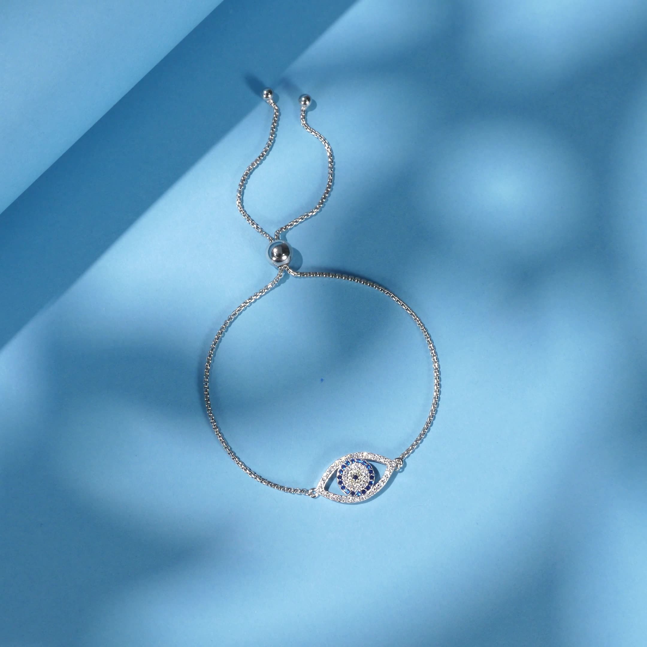 This elegant 925 sterling silver bracelet features a stunning evil eye charm, fully adorned with shimmering white and blue cubic zirconia for a radiant finish. The openwork design adds a touch of lightness, while the adjustable slider ensures a perfect fit for any wrist. A symbol of protection and positive energy, this evil eye bracelet is perfect for everyday wear or gifting.