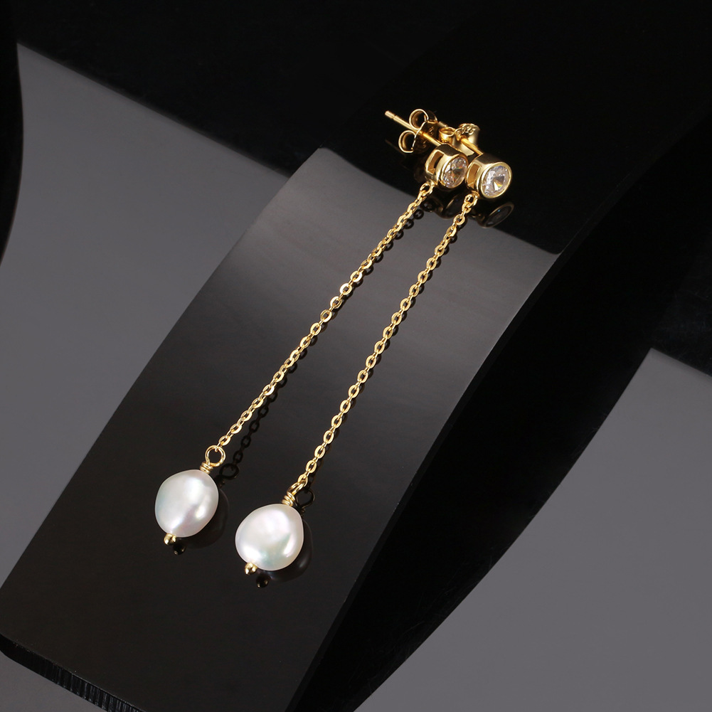 925 Sterling Silver Zirconia Fresh Water Pearl Tassel Stud Earring 40500044