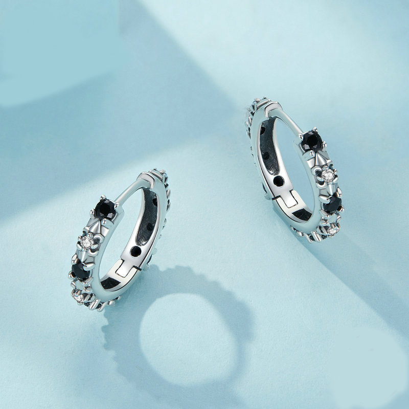 Product: Wholesale 925 Sterling Silver Iris Flower Black Zirconia Hoop Earrings 60200164.