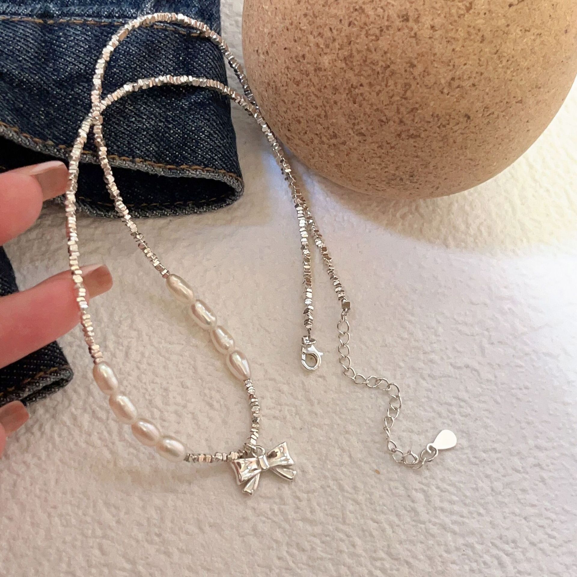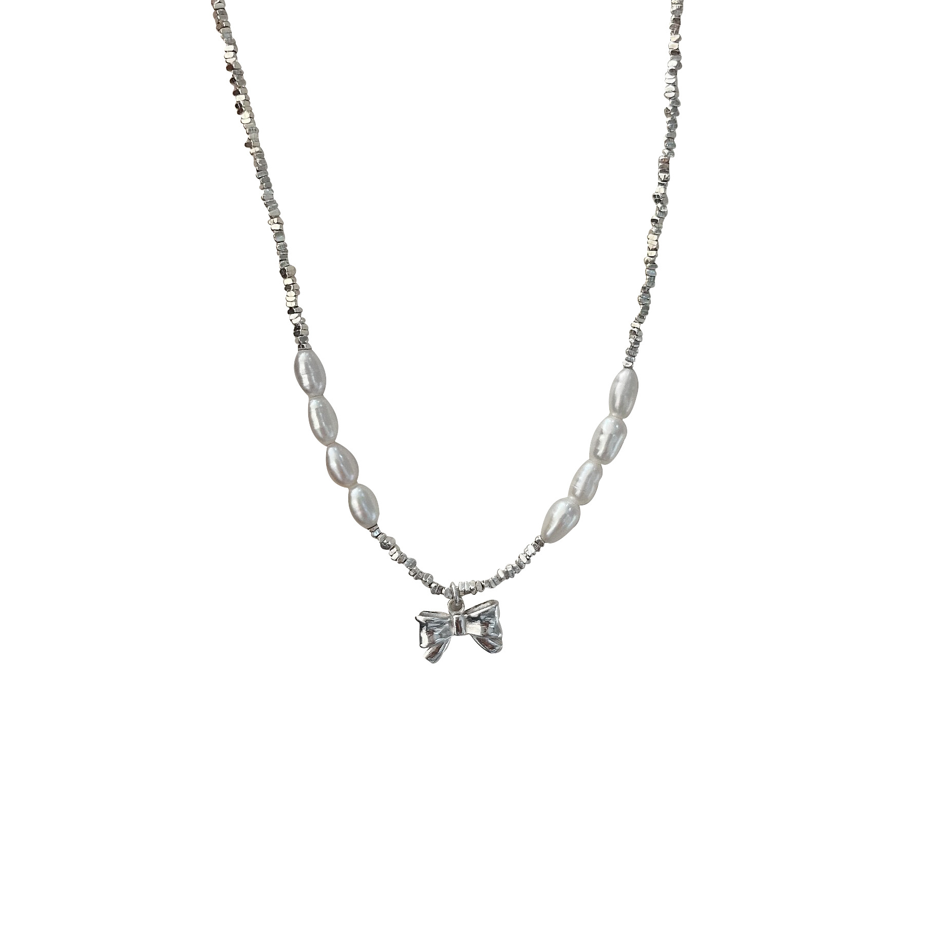 Product: Wholesale 925 Sterling Silver Pearl Crushed Silver Bow Pendant Necklaces 80200213.