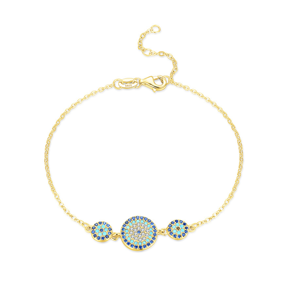 This dazzling evil eye bracelet is crafted from high-quality 925 sterling silver and features a triple charm design, each eye fully encrusted with brilliant white and turquoise blue cubic zirconia. Symbolizing protection and good fortune, the vibrant evil eye motif is a timeless favorite. Finished with an adjustable chain and secure clasp, this bracelet makes a meaningful and stylish gift.